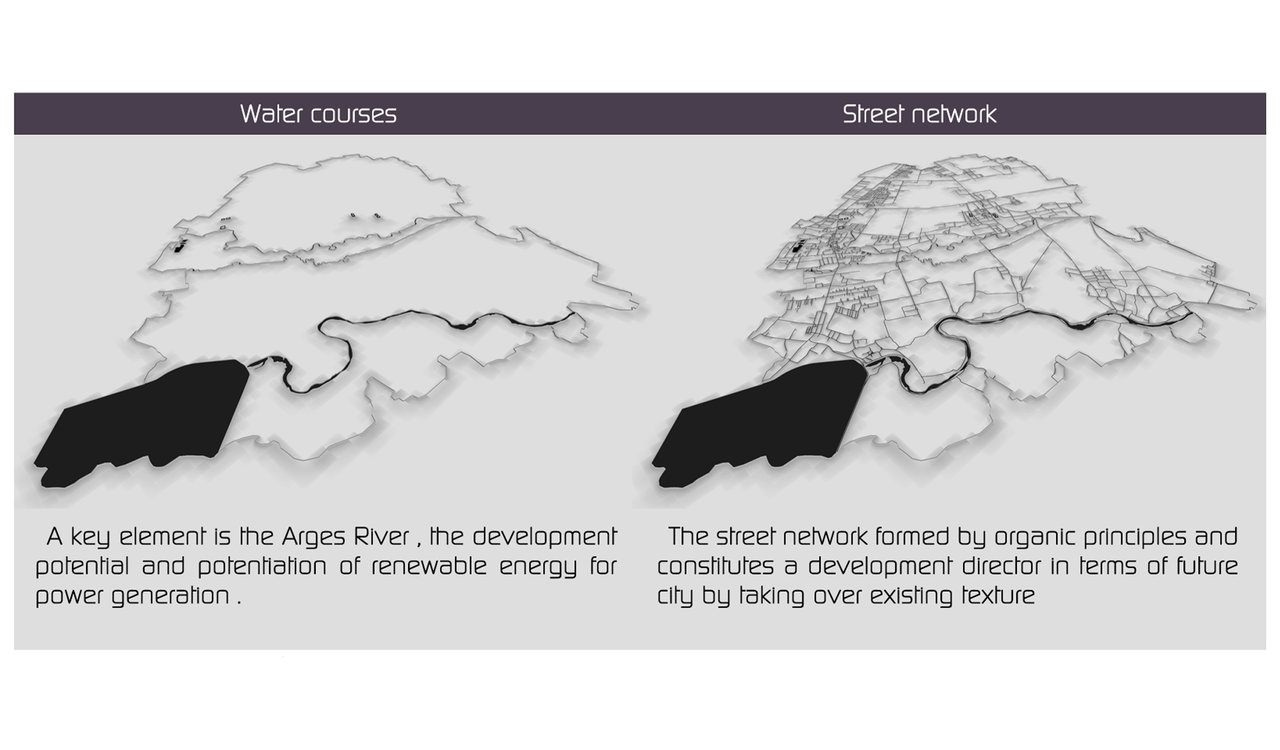 The two office centers made at the ends of the city, creates an oscillation between them and being linked with a green promenade, with an integrated transport, green spaces, seating areas and a whole complex of shops and restaurants.